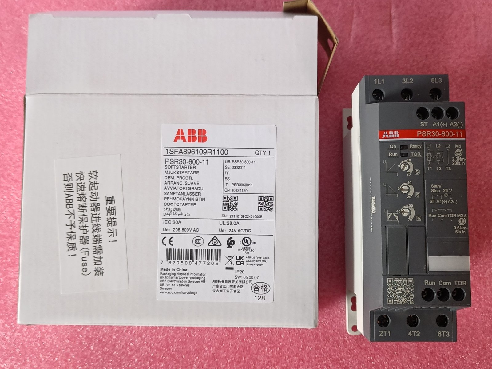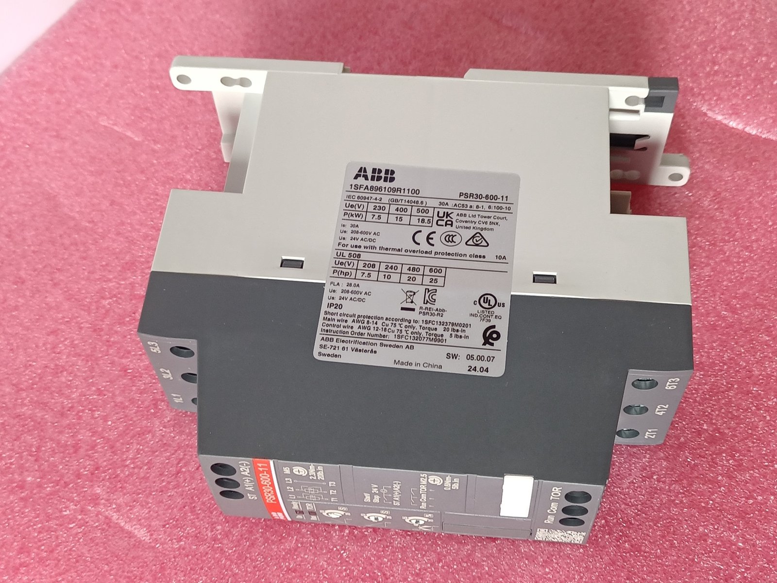 The softstarter PSR30-600-11 has a rated maximum operational current of 30 A with an operating voltage span from 208…600 V AC. The rated control voltage is 24 V AC/DC. PSR features a two-phase control soft start and stop through a voltage ramp. It has built-in bypass for easy installation and energy saving. A RUN and a TOR signal is available from a relay output in NO (normally open state).